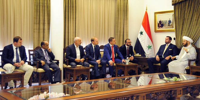 ولفت المفتي حسون خلال لقائه اليوم الوفد الدولي للصناعيين ورجال الأعمال الروس إلى أن الشعب السوري الملتف حول جيشه وقيادته الشجاعة والذي يفخر بدعم اصدقائه بدأ يحصد نتائج صموده بالانتصار في حربه ضد الإرهاب.