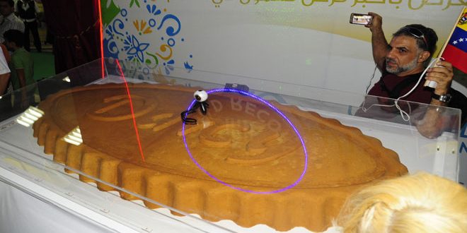 عرضت شركة التغذية للصناعات الغذائية “فودكو” أكبر قرص معمول في العالم قامت بتصنيعه ضمن فعاليات الدورة الـ 59 لمعرض دمشق الدولي استعدادا لدخول موسوعة “غينيس” العالمية للأرقام القياسية.