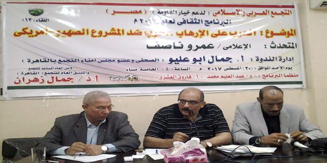 من جهته شدد الدكتور جمال زهران المنسق العام للتجمع العربي والإسلامي لدعم خيار المقاومة بمصر على أن الحرب الراهنة ضد الإرهاب هي بالأساس حرب ضد المشروع الصهيوني وأن الثورة الحقيقية هي الوقوف ضد محاولات تدمير سورية.