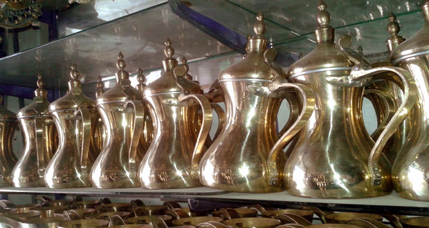عادة تقديم القهوة من مصب نحاسي متوارثة منذ القدم وهي موجودة في كل بيت سوري وقد نافس المصب الحديث بأنواعه العديدة في هذه العادة ولكن المصب النحاسي استعاد صدارته بحلة جديدة وقد زينته النقوش الليزرية فبدا رائعا كتحفة فنية أضاف للقهوة قيمة معنوية.