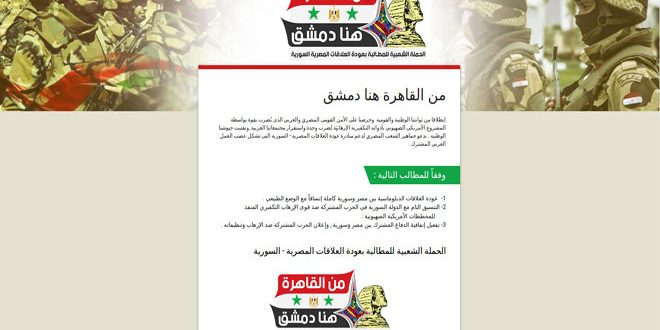 دشنت شخصيات سياسية وإعلامية مصرية أمس حملة توقيعات الكترونية وشعبية لعودة العلاقات المصرية السورية كاملة تحت شعار “من القاهرة هنا دمشق”.