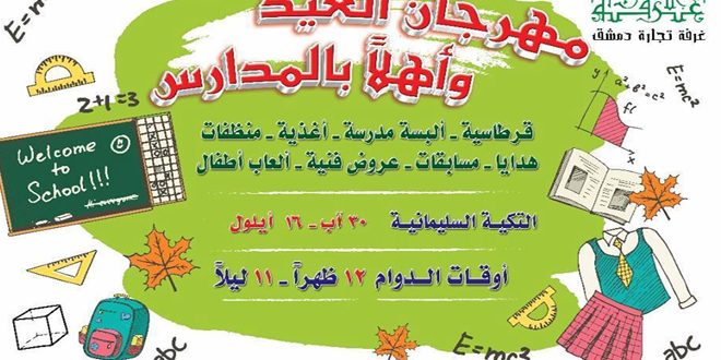أعلنت غرفة تجارة دمشق تنظيم مهرجان العيد وأهلاً بالمدارس للتسوق على أرض التكية السليمانية بدمشق اعتبار من 30 الشهر الجاري ولغاية 16 شهر أيلول القادم.