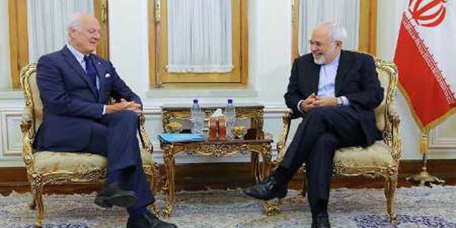 بحث المبعوث الخاص للأمم المتحدة الى سورية ستافان دي ميستورا مع وزير الخارجية الإيراني محمد جواد ظريف في طهران اليوم آخر التطورات في سورية والمبادرات السياسية لتسوية الأزمة فيها عبر الحوار.
