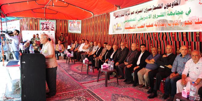 من جهته حذر أمين سر تحالف قوى المقاومة الفلسطينية خالد عبد المجيد من تعرض القضية الفلسطينية لمفصل تاريخي خطر عبر الالتفاف على محور المقاومة وتصفية القضية داعيا إلى التسلح بالوعي والعلم والعمل معا جمعيا من أجل الانتصار على العدو الاسرائيلي وإقامة الدولة الفلسطينية وإعادة حقوق شعبها.