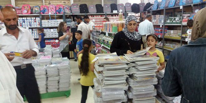 وفي هذا السياق أيضاً افتتحت المؤسسة السورية للتجارة معارض القرطاسية والألبسة والأحذية المدرسية في جميع المحافظات لتوفير كل ما يحتاجه الطالب بأسعار مناسبة ومنافسة لأسعار القطاع الخاص بنسبة تتراوح بين 20 و 50 بالمئة في جميع صالاتها ومنافذ بيعها إضافة إلى البيع بالتقسيط بحدود خمسين ألف ليرة سورية للعاملين في الدولة.