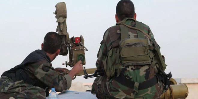 وقضت وحدات من الجيش الأحد الماضي على 13 إرهابياً من تنظيم “داعش” أصابت آخرين في منطقة وادي العذيب أثناء محاولتهم الاعتداء على نقاط عسكرية بغية فتح ثغرة لفك الحصار عن الإرهابيين في محور صبورة أثريا بريف سلمية الشرقي.