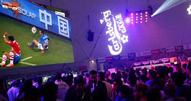 بعيدا عن التزاحم في أماكن الترفيه العامة أو ضيق الأماكن في المنازل يمكن لسكان برلين المغرمين بكرة القدم متابعة مباريات كأس العالم في جو مغاير تماما يوفر الجلوس على أرائك واسعة أمام شاشة تلفزيون عملاقة تبلغ مساحتها 700 بوصة.