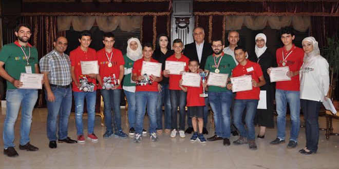 كرمت محافظة حمص اليوم الفريق الفائز بالمركز الأول والمشاركين والمدربين في المسابقة الوطنية لأولمبياد الروبوت العالمي من فرع الجمعية العلمية السورية للمعلوماتية بحمص التي أقيمت في صالة تشرين الرياضية بدمشق .