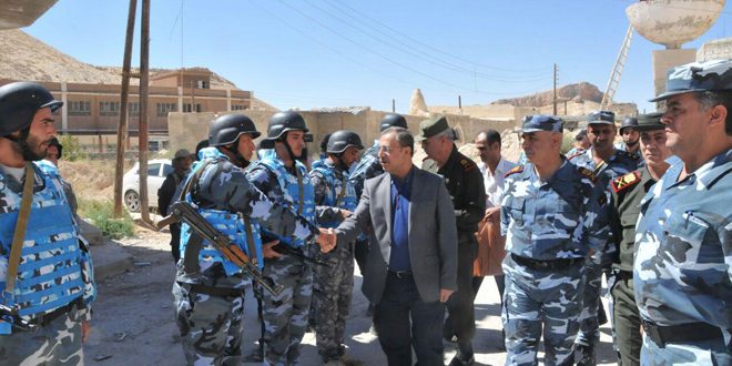 كما تفقد الوزير الشعار اليوم وحدة حفظ الأمن والنظام والمهام الخاصة في حمص وهنأهم بمناسبة عيد الأضحى المبارك مثنيا على الدور والمهام البطولية التي يقومون بها في حفظ الأمن والاستقرار في حمص وعلى جبهات القتال إلى جانب القوات المسلحة لتطهير كامل تراب الوطن من دنس الإرهاب.