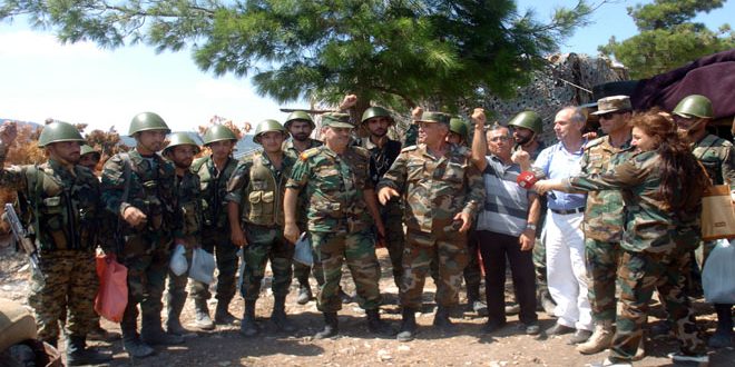 بمناسبة عيد الأضحى المبارك قدم وفد من فرع رابطة المحاربين القدماء وضحايا الحرب باللاذقية اليوم التهنئة لبواسل الجيش العربي السوري بالعيد في إحدى النقاط العاملة قرب بلدة كبانة في الريف الشمالي.