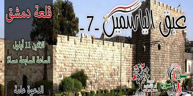 تطلق وزارتا السياحة والثقافة فعاليات كرنفال عبق الياسمين السابع عند الساعة السابعة من مساء يوم الاثنين المقبل بالتعاون مع فريق “نسور سوريا” التطوعي ومجموعة أم الشهيد بمشاركة نخبة من الشخصيات الفنية والإعلامية والاجتماعية السورية وذلك في قلعة دمشق.