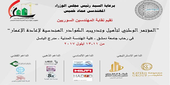 برعاية رئيس مجلس الوزراء المهندس عماد خميس تنطلق بعد غد الاثنين فعاليات المؤتمر الوطني لتأهيل وتدريب الكوادر الهندسية لإعادة الإعمار الذي تنظمه نقابة المهندسين على مدرج الباسل بكلية الهندسة المدنية بجامعة دمشق.