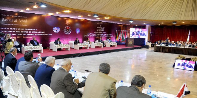أكد المشاركون في الملتقى النقابي الدولي للتضامن مع عمال وشعب سورية ضد الإرهاب والحصار والعقوبات الاقتصادية وسياسات التدخل الامبريالي تضامن عمال وشعوب بلدانهم مع عمال وشعب سورية ودولتهم الوطنية ومواصلة دعم نضالهم الوطني ضد سياسات وانتهاكات القوى الامبريالية والصهيونية والرجعية والتدخل في الشؤون الداخلية للشعب السوري.