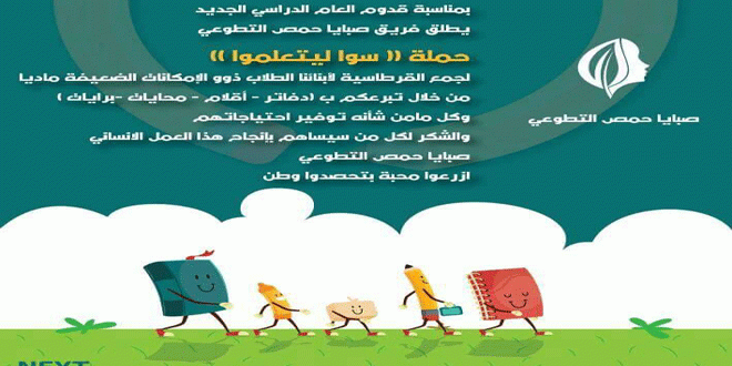 مبادرة مجتمعية جديدة لفريق “صبايا حمص التطوعي” حملت عنوان “سوا ليتعلموا” انطلقت فعالياتها قبل أيام قليلة بهدف جمع أكبر كمية ممكنة من قرطاسية المدرسة ومستلزماتها وتوزيعها على الشرائح الأكثر حاجة في أحياء النازحين والمهاجرين بحمص.