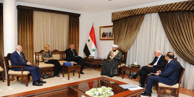 أكد سماحة المفتي العام للجمهورية الدكتور أحمد بدر الدين حسون خلال لقائه اليوم وفدا من مجلس الشيوخ الإيطالي برئاسة السيناتور باولو روماني رئيس الوفد الإيطالي إلى الجمعية العامة للمجلس الأوروبي أن الانتصارات التي تحققها سورية في حربها ضد الإرهاب تصب في مصلحة المنطقة والعالم.