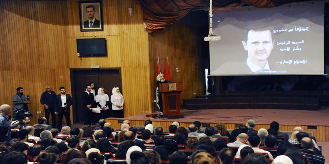 كرم فرع جامعة دمشق لحزب البعث العربي الاشتراكي مكتب متابعة شؤون أسر الشهداء بالتعاون مع الجمعية العلمية السورية للمعلوماتية المشاركين في الدورة التدريبية من ذوي الشهداء وعاملي وطلاب الجامعة لنيل الشهادة الدولية لقيادة الحاسب (آي سي دي إل) وذلك على مدرج الباسل في كلية الهندسة المدنية بجامعة دمشق.
