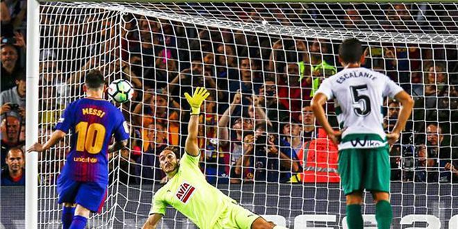 عزز نادي برشلونة اليوم صدارته لدوري الدرجة الأولى الإسباني لكرة القدم بفوز ساحق على إيبار بستة أهداف لهدف.