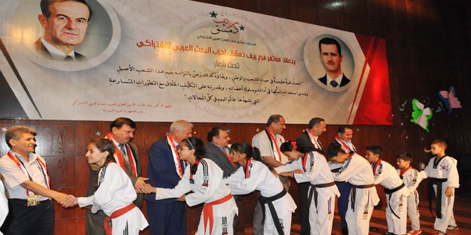 كرم فرع ريف دمشق للاتحاد الرياضي العام خلال احتفالية أقيمت في المجمع التربوي بضاحية قدسيا في محافظة ريف دمشق اليوم لاعبي ولاعبات المحافظة المميزين الذين أحرزوا مراكز متقدمة في البطولات المحلية والخارجية.