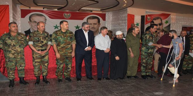 أقامت اللجنة الأمنية في حلب بالتعاون مع مؤسسة “سورية قلب واحد للتنمية” حفلا تكريميا لمئة من جرحى الجيش والقوات المسلحة بصالة عشتار في المدينة.