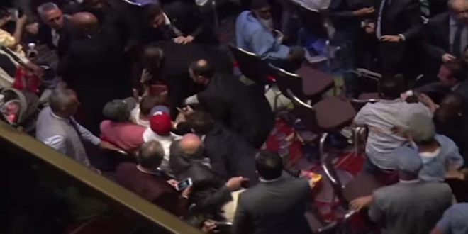 وتناقلت وسائل إعلام عدة صورا لعناصر الشرطة والحراس أثناء إخراجهم متظاهرين اعترضوا على كلمة أردوغان داخل فندق ماريوت ماركيز في نيويورك.