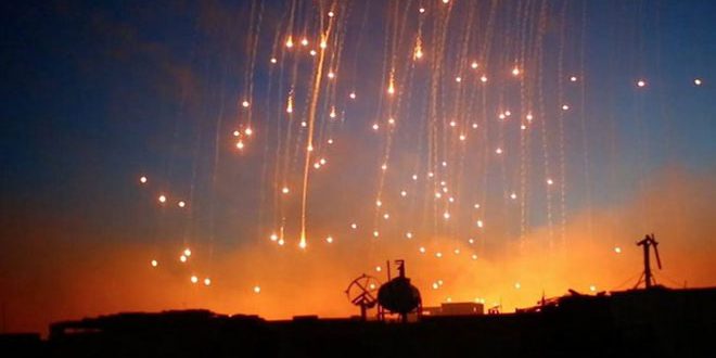 وأفادت مصادر أهلية وإعلامية متطابقة بأن طائرات “التحالف الدولي” بقيادة الولايات المتحدة الذي يزعم محاربة تنظيم داعش الإرهابي قصفت بقنابل مزودة بالفوسفور الأبيض المحرم دوليا أطراف بلدة الصور في ريف دير الزور الشمالي الشرقي.