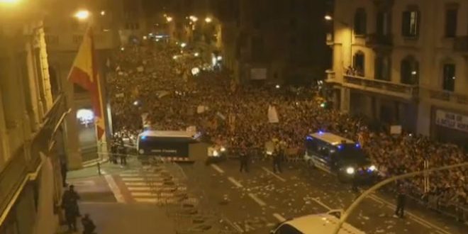 إلى ذلك احتشد متظاهرون مؤيدون للانفصال في ساحة الجامعة وأمام مقر الشرطة العامة في مدينة برشلونة في ختام يوم شهد إضرابا شل معظم قطاعات المدينة.