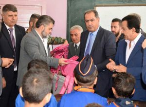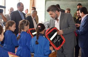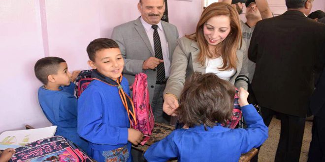 وزع الاتحاد العام لنقابات العمال اليوم حقائب وقرطاسية مدرسية على التلاميذ من أبناء الجولان والقنيطرة وذلك في عدد من مدارس المحافظة في تجمع برزة للنازحين بدمشق.