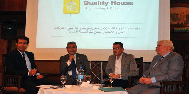 واستعرض المدير التنفيذي للمشروع 66 جمال اليوسف التسهيلات والإجراءات التي شملها تنظيم هذه المنطقة العقارية وتحفيز الحركة العقارية بينما لفت المهندس محمد خير بني المرجة إلى توافر الخبرات السورية القادرة على تصميم المنشات الضخمة داعيا إلى توفير الية عمل تحقق التالف بين المكاتب الهندسية.