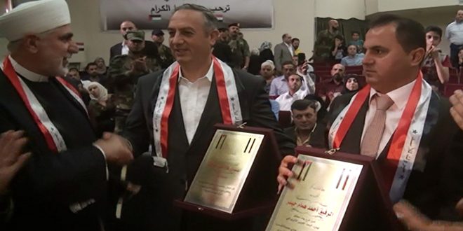 وعبر عدد من ذوي الشهداء المكرمين عن فخرهم واعتزازهم بتضحيات أبنائهم الذين بذلوا مهجهم في سبيل الدفاع عن الوطن ضد الارهاب الظلامي الذي أراد قتل الحياة وتدمير حضارة سورية العريقة مؤكدين أنهم سائرون وأبناؤهم على الطريق الذي أنارته دماء أبنائهم الطاهرة خلف الجيش العربي السوري حتى تحقيق النصر المؤزر على الإرهاب وإعادة الأمن والاستقرار إلى ربوع سورية الحبيبة.