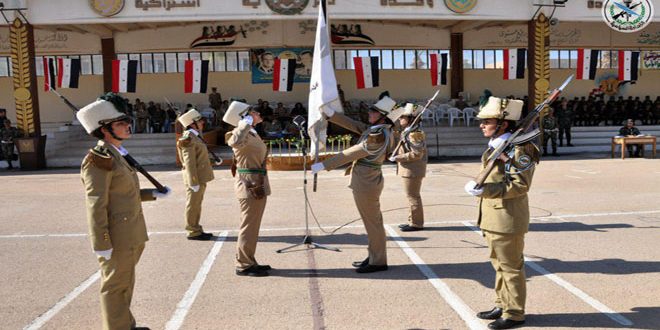 بدأ الاحتفال بالوقوف دقيقة صمت إجلالا وإكبارا لأرواح الشهداء الأبرار تلاه النشيد العربي السوري وبعد ذلك جرى عرض عسكري شاركت فيه دورات الكلية.