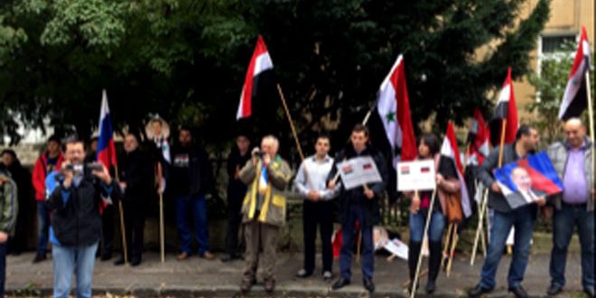 وتجمع المشاركون في ساحات الحرية بالعاصمة السلوفاكية براتيسلافا وكالفين في العاصمة الهنغارية بودابست وفاتسلاف وسط العاصمة التشيكية براغ وأمام السفارة الروسية في ألمانيا وفرنسا والسفارة السورية برومانيا حيث حملوا لافتات تضامنية تعبر عن افتخارهم بانتصارات الجيش العربي السوري في مواجهته الإرهاب والإرهابيين وتحيي صمود أبناء الشعب السوري كما رفعوا الأعلام الوطنية وصور السيد الرئيس بشار الأسد.