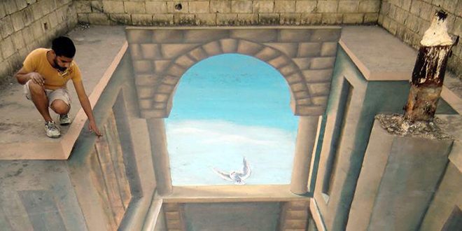 أنهى التشكيلي أحمد جرعتلي تنفيذ رسم ثلاثي الأبعاد بحجم كبير على سطح منزله في مدينة مصياف بمحافظة حماة خلال أقل من شهر أراد عبره تقديم رسالة فنية للعالم عن انطلاق عملية إعادة إعمار سورية بصورة متوافقة مع متطلبات العصر وتنتمي لحضارتها وإرثها بذات الوقت.