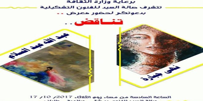 تقيم صالة السيد للفنون التشكيلية بدمشق عند الساعة السادسة من مساء الثلاثاء القادم معرضا بعنوان “تناقض” للفنانين نهى جبارة وعبد الله عبد السلام.
