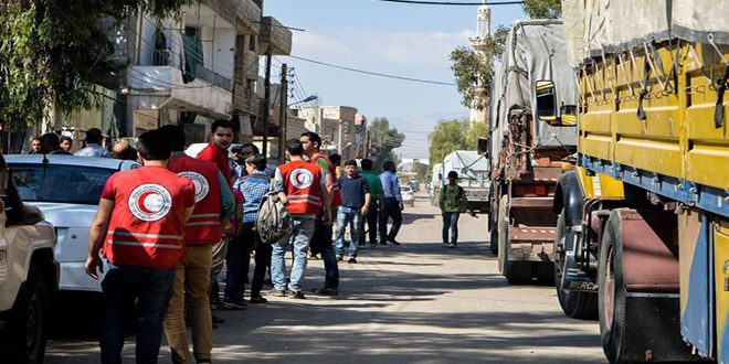 وأشار مراسل سانا إلى أنه تم إيصال 5 شاحنات محملة بسلات غذائية وصحية ومواد متنوعة مبينا أن القافلة مقدمة ل500ر2 شخص من بلدة كناكر.