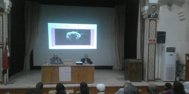 وقدم رئيس شعبة أمراض الدم والأورام في المشفى الوطني بالسويداء الدكتور مؤءنس أبو منصور عرضا حول تعريف سرطان الثدي وانتشاره لدى النساء مشيرا إلى أهم علاماته وأعراضه والعوامل التي تزيد خطورة الإصابة به مثل السمنة وشرب الكحول والتعرض للإشعاع وعدم ممارسة الرياضة ومانعات الحمل والتأخر بالانجاب .