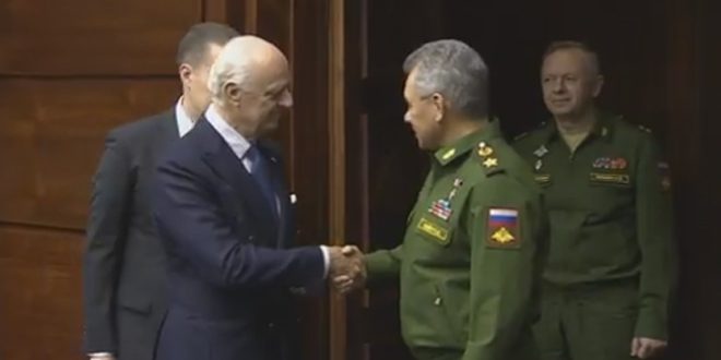 بحث وزير الدفاع الروسي سيرغي شويغو ومبعوث الأمم المتحدة إلى سورية ستافان دي ميستورا خلال لقائهما في موسكو اليوم آفاق التسوية السياسية للأزمة في سورية.