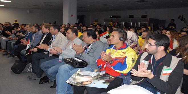 وأشار عمر العاروب نائب رئيس الوفد الطلابي والشبابي السوري إلى أن سورية انتصرت على الإرهاب والعدوان بفضل بطولات الجيش العربي السوري والتفاف الشعب السوري حوله ودعم حلفاء سورية.