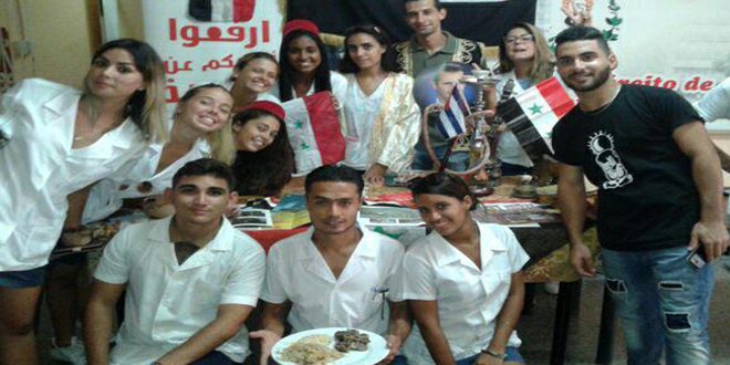 جاء ذلك خلال مشاركة الطلبة في الأسبوع الثقافي لكل من المدرسة الأمريكية اللاتينية للطب “ايلام” وجامعة الفهاردو في العاصمة الكوبية هافانا حيث أقام الطلبة جناحا خاصا بسورية عرضوا خلاله عددا من البروشورات والمجلات والصحف التي تتحدث عن سورية وحضارتها الغنية وتاريخها العريق كما رفعوا الأعلام السورية وصور السيد الرئيس بشار الأسد.