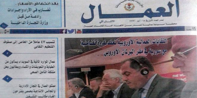 ركز العدد الجديد من جريدة كفاح العمال الاشتراكي الصادرة عن الاتحاد العام لنقابات العمال على مطالبة النقابات العمالية الأوروبية بفك الحصار والعقوبات الجائرة على الشعب السوري وعمال سورية وذلك في ورشة العمل التي عقدها رؤساء الاتحادات الأوروبية بحضور رئيس الاتحاد العام لنقابات العمال في سورية جمال القادري وعدد من البرلمانيين الأوروبيين في مقر البرلمان الأوروبي ببروكسل.