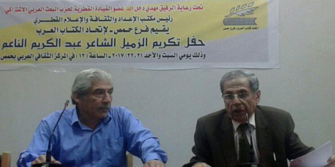 تضمن اليوم الثاني من حفل تكريم الشاعر عبدالكريم الناعم الذي أقامه فرع حمص لاتحاد الكتاب العرب شهادات ودراسات وشعرا للمحتفى به وذلك في المركز الثقافي بحمص.