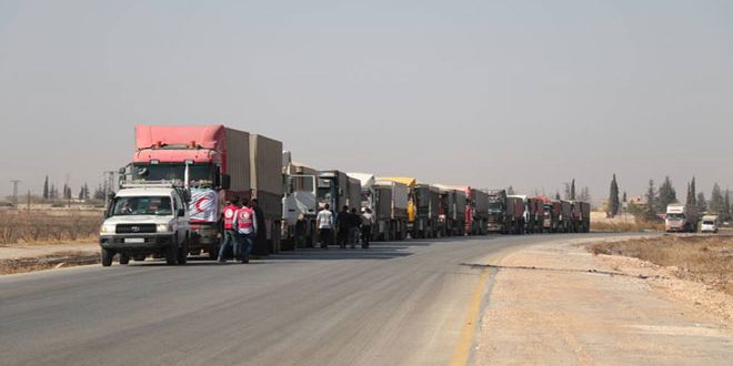 وذكر بيان صادر عن منظمة الهلال الأحمر العربي السوري تلقت سانا نسخة منه أن القافلة مقدمة من اللجنة الدولية للصليب الأحمر وهي مؤلفة من ” 14 شاحنة محملة بـ 4 آلاف سلة غذائية و4 آلاف سلة غذائية معلبة و4 آلاف سلة صحية و10 آلاف بطانية ومواد مستلزمات أساسية للأطفال”.