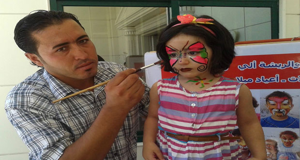 سانا المنوعة التقت الرسام علي سليمان أحد حرفيي فن الرسم الذي قال إنه وجه موهبته وفنه في الرسم لإسعاد الأطفال وقد تخصص في رسم الشخصيات الكرتونية او الحيوانات الاليفة على وجوه الأطفال الذين يعبرون عن فرحهم بعد روءية وجوههم وقد تحولت إلى شخصية كرتونية أحبوها او من خلال تزيين الوجه بزهرة او فراشة وغيرها من الأشكال التي يرسمها لهم.