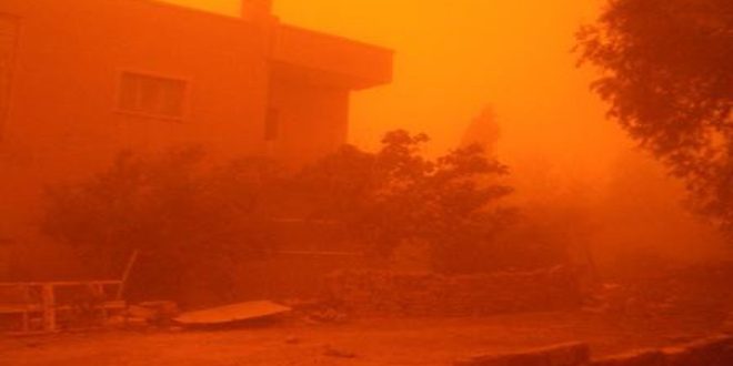 وذكر مراسل سانا أن “المدينة تتعرض منذ ساعات الظهيرة لعاصفة غبارية شديدة تسببت بحجب الرؤية وحولت الأجواء إلى شبه مظلمة”.