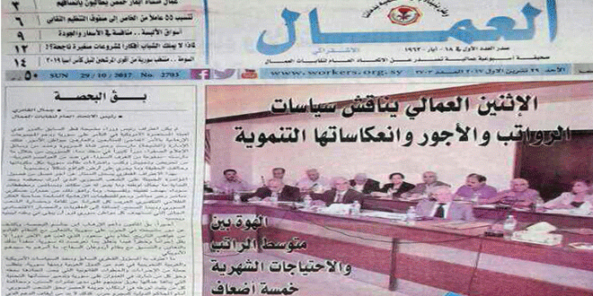 وفي افتتاحيته كتب رئيس الاتحاد العام لنقابات العمال جمال القادري مقالا جاء فيه “مع تواصل الانتصارات التي يحققها بواسل الجيش العربي السوري على امتداد ساحة الوطن وتطهيرهم الكثير من المناطق من رجس التنظيمات الارهابية لم يعد بامكان المتآمرين سوى التراجع والاعتراف بجرائهم ومحاولة طلب الغفران”.