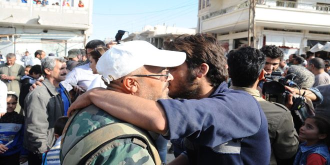 وقامت الجهات المعنية بتأمين وصول المحررين إلى مدينة القريتين وتسليمهم إلى ذويهم وسط استقبال شعبي لهم في ساحة البلدة حيث أكد الأهالي خلال الاستقبال عن فرحتهم بعودة ابنائهم بفضل تضحيات وجهود الجيش العربي السوري.