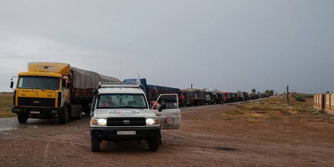 ويقوم الهلال الأحمر العربي السوري بالإشراف على توزيع المساعدات الإنسانية وإيصالها إلى مختلف المناطق وقد تعرضت قوافله أكثر من مرة لاعتداءات من قبل التنظيمات الإرهابية التكفيرية في محاولة لمنع وصول المساعدات إلى العائلات المتضررة من جرائم الإرهابيين.