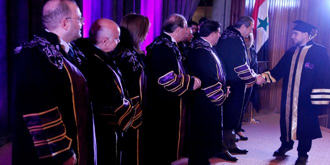 وحضر الحفل معاون وزير التعليم العالي لشؤون الجامعات الخاصة الدكتور بطرس ميالة وعضو المكتب التنفيذي للاتحاد الوطني لطلبة سورية دارين سليمان ورئيس مجلس أمناء الجامعة الدكتور وائل الحلقي وحشد من أسر الطلبة الخريجين وزملائهم.