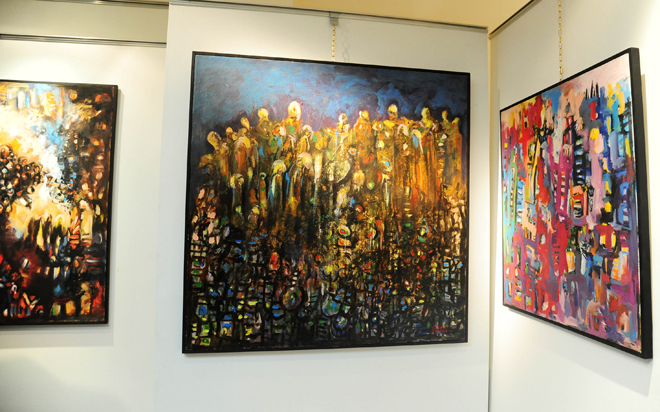 ولمس المشاهد الزخم اللوني الذي امتلأت به الأعمال والتي لم تختلف عن أجواء الأعمال الجدارية التي نفذها فريق إيقاع الحياة تحت إشراف الفنان مخول حيث طغت أجواء الاحتفال وكانت الألوان ألعابا نارية ترسم نور الفرح من خلال ثلاث وعشرين لوحة بقياسات متنوعة بتقنية الإكريليك على القماش وبأسلوب تجريدي.