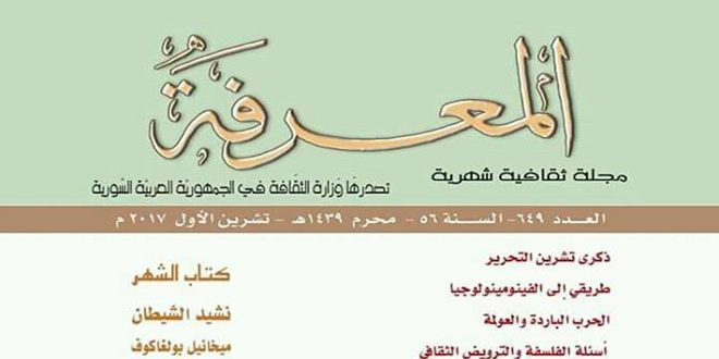 حفل العدد الجديد من مجلة المعرفة الثقافية الشهرية الصادرة عن وزارة الثقافة بعدد من الدراسات والبحوث الى جانب كتاب المعرفة الشهري بعنوان “نشيد الشيطان” لميخائيل بولغاكوف ترجمة الدكتورين ثائر زين الدين وفريد حاتم الشحف.