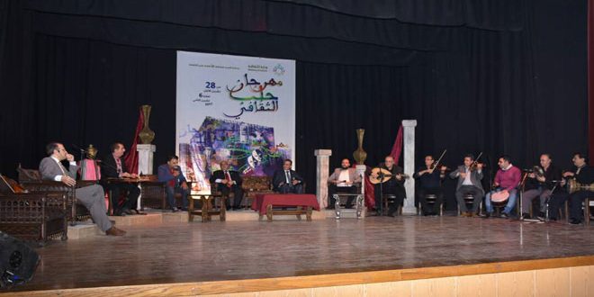 تواصلت لليوم السابع على التوالي فعاليات مهرجان حلب الثقافي الذي تقيمه وزارة الثقافة حيث أقيمت مساء اليوم سهرة فنية طربية على مسرح نقابة الفنانين أحياها كل من المطربين أحمد خيري وعبود حلاق وفارس أحمر وطاهر خانطوماني قدموا خلالها مجموعة من الأغاني التراثية والفلكلورية والطربية والموشحات الأندلسية.